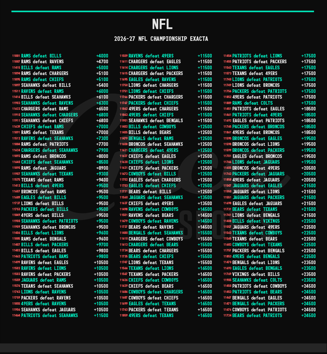 Read MoreWe’re down to the divisional round of the playoffs and Circa Sports still has plenty of way to bet the NFL Playoffs. While a lot of the value in betting individual teams has disappeared, there’s still at least one interesting way to bet the playoffs while getting a big potential payout while just making one bet. And that’s betting the possible NFL Championship Exacta. Instead of simply betting the Chiefs to win it all at +290, if you think the 49ers are going to be their opponent in the Big Game, you can bet that a much juicier +825. Every…